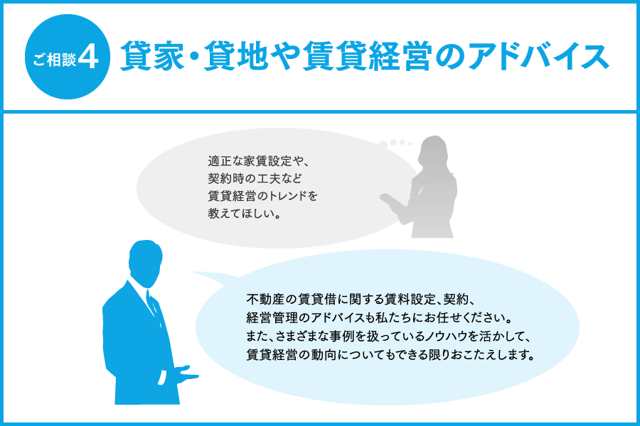 ● 所有土地の有効活用 ● 不動産投資 ● 相続対策 ● 貸宅地、貸家の整理 ● 複数地権者の権利調整 ● 競売物件の取得 ● 企業のリストラに伴う不動産売却 等々